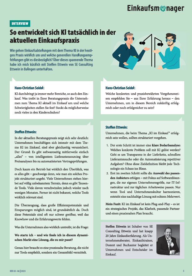 Interview von Steffen Ettwein in der renommierten Einkaufsfachzeitschrift „Einkaufsmanager“