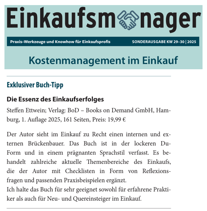 Hans-Christian Seidel ist der Chefredakteur der renommierten Fachzeitschrift „Einkaufsmanager“ und in der Sonderausgabe für KW 29/30 mein Buch empfohlen.